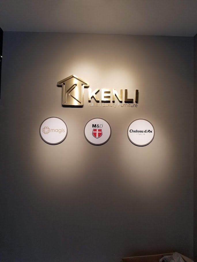 Chữ nổi Kenli được thiết kế kích thước vừa phải, thể hiện được sự sang trọng mà vẫn nhẹ nhàng, hợp với phong cách cổ điển châu Âu. Phía dưới là 3 bảng hiệu tròn đề tên 3 thương hiệu đồ nội thất mà Kenli chuyên cung cấp. Mỗi bảng hiệu tròn cũng được gia công hết sức tinh tế, mang lại vẻ đẹp hài hòa cho tổng thể.