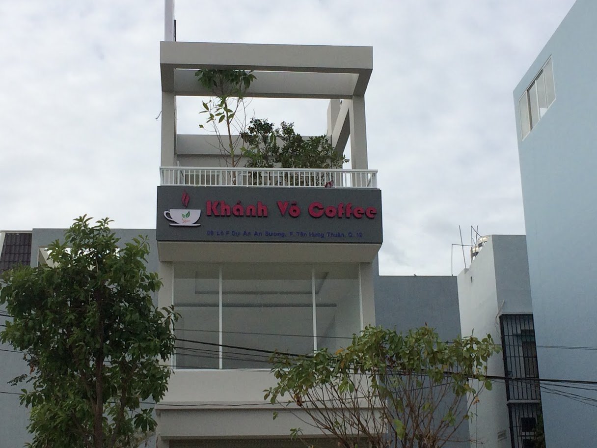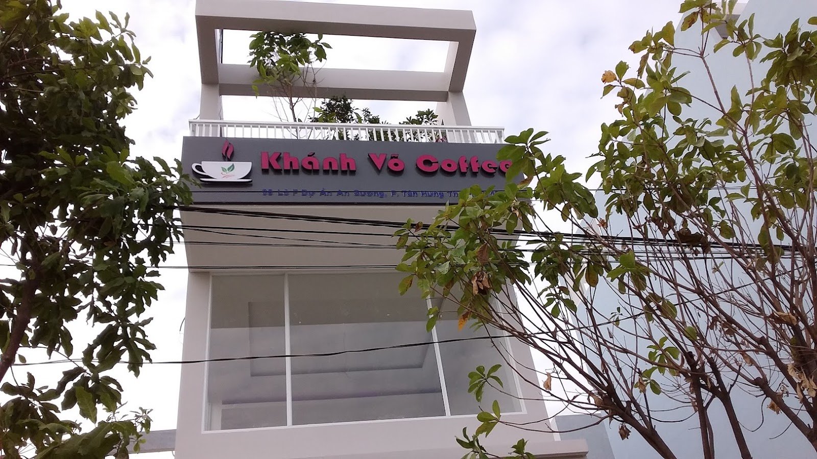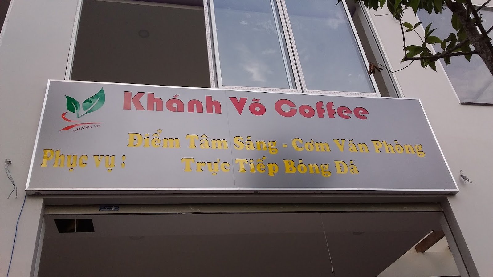 Bảng hiệu được đặt ngay trước mặt tiền của quán cà phê tuy đơn giản nhưng lại mang đến ấn tượng mạnh mẽ bởi sự phối hợp màu sắc rất thẩm mỹ, phù hợp để gây hiệu ứng cho quán. Dòng chữ Khánh Võ coffee màu đỏ nổi bật trên nền màu xám cùng hình ảnh tách cà phê màu trắng là những chi tiết đáng kể mang tính thẩm mỹ cùng những ý nghĩa độc đáo. Có thể nói, màu chữ đỏ vừa thể hiện được sự nổi bật vừa mang ý nghĩa về sự mua may bán đắt bởi màu đỏ là màu của sự nhiệt huyết, của sự may mắn.